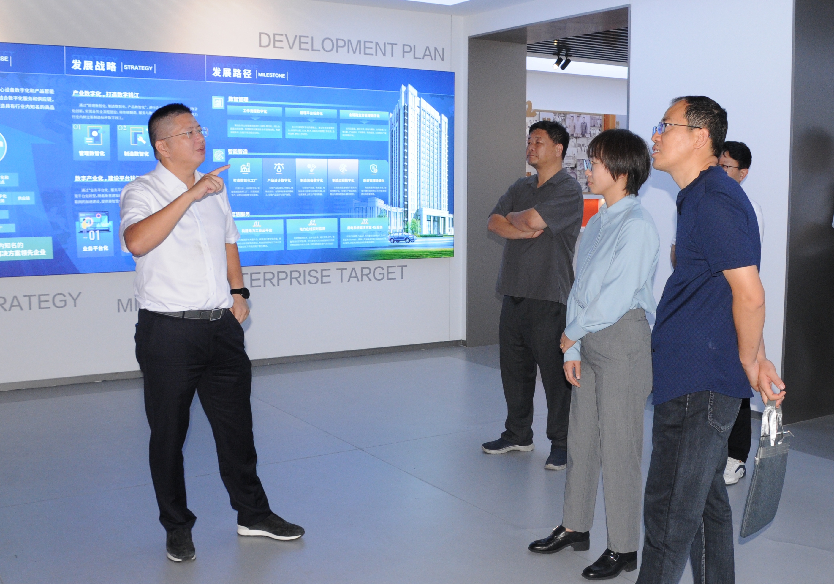 項勇陪同上級領導參觀了公司展廳,介紹了公司的發展歷程、行業地位、產品研發、技術改造、節能降耗、數字化工廠建設和綜合能源管理系統、數智大腦管理系統應用等。